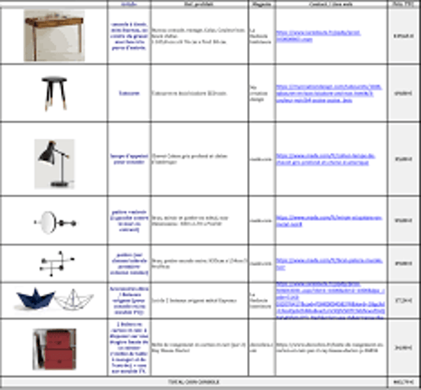 - Shopping list (meubles + déco avec liens)
